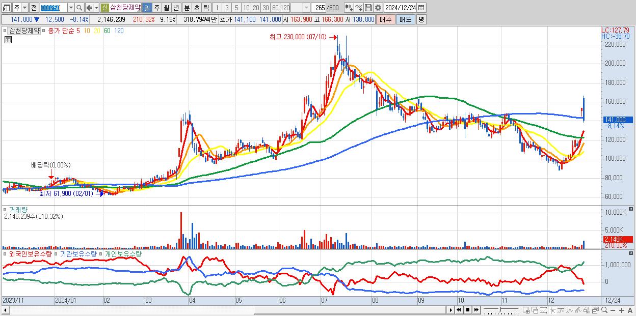 - 삼천당제약 (141,000원 ▼ -8.14% , 시총: 33,075억, 거래량: 2,146,239, 거래대금:3,188억)