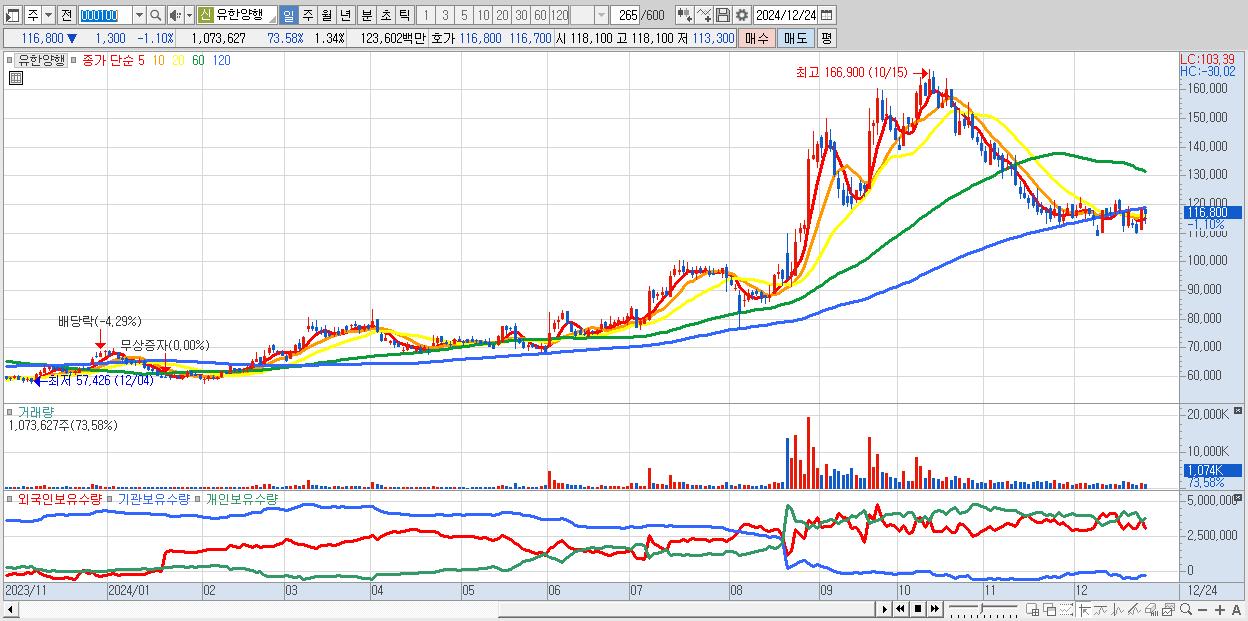- 유한양행 (116,800원 ▼ -1.1% , 시총: 93,684억, 거래량: 1,073,627, 거래대금:1,236억)