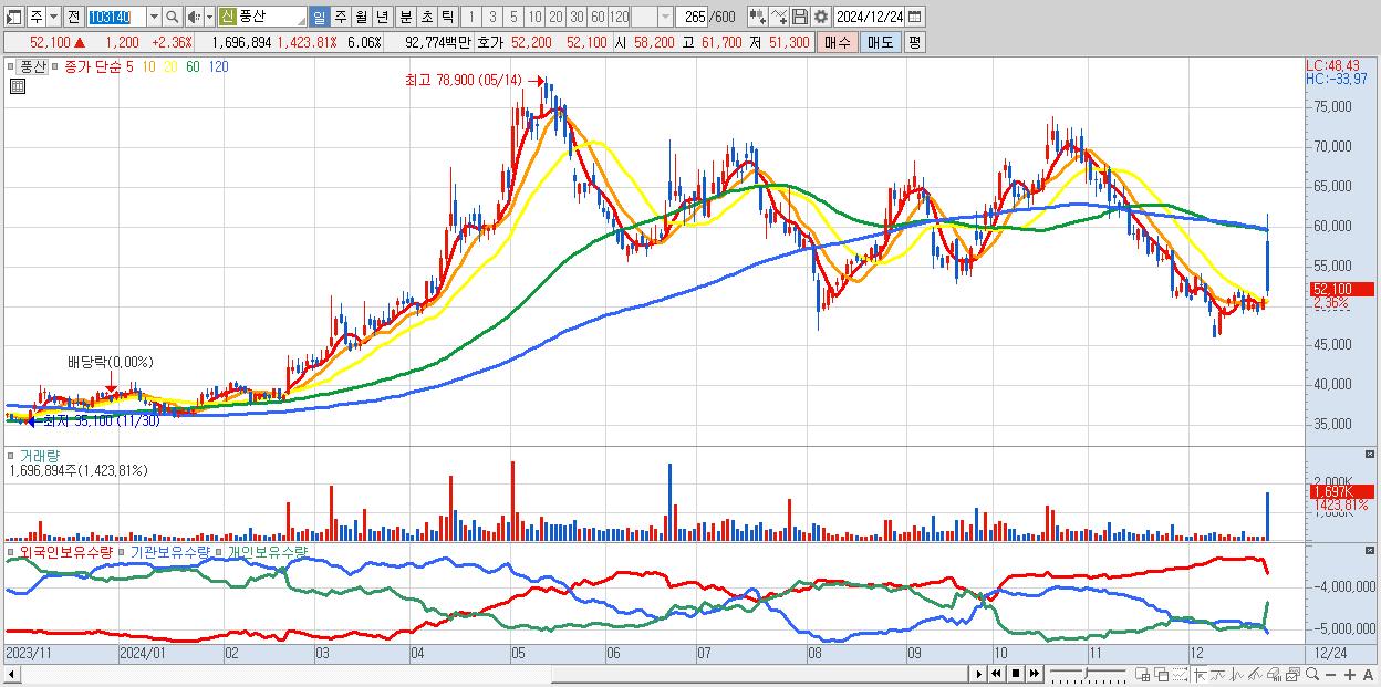 - 풍산 (52,100원 ▲ 2.36% , 시총: 14,601억, 거래량: 1,696,894, 거래대금:928억)