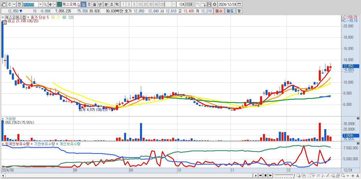 - 에스오에스랩 (12,850원 ▼ -0.08% , 시총: 2,272억, 거래량: 7,058,235, 거래대금:906억)