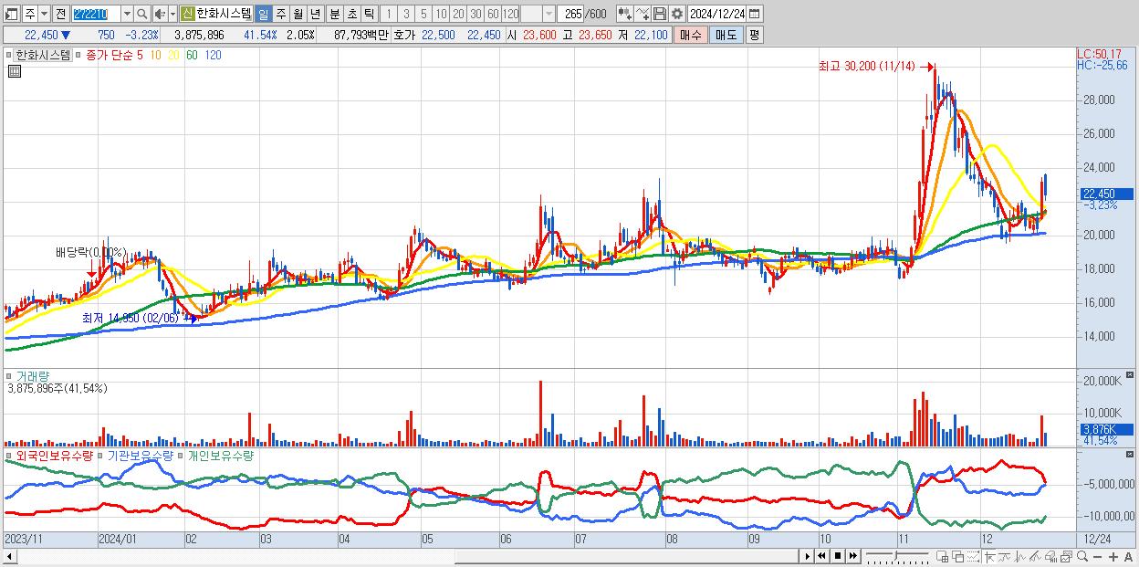 - 한화시스템 (22,450원 ▼ -3.23% , 시총: 42,412억, 거래량: 3,875,896, 거래대금:878억)