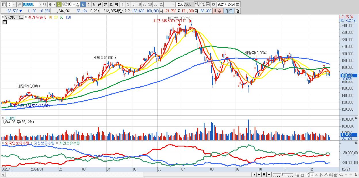 - SK하이닉스 (168,500원 ▼ -0.65% , 시총: 1,226,684억, 거래량: 1,844,961, 거래대금:3,129억)