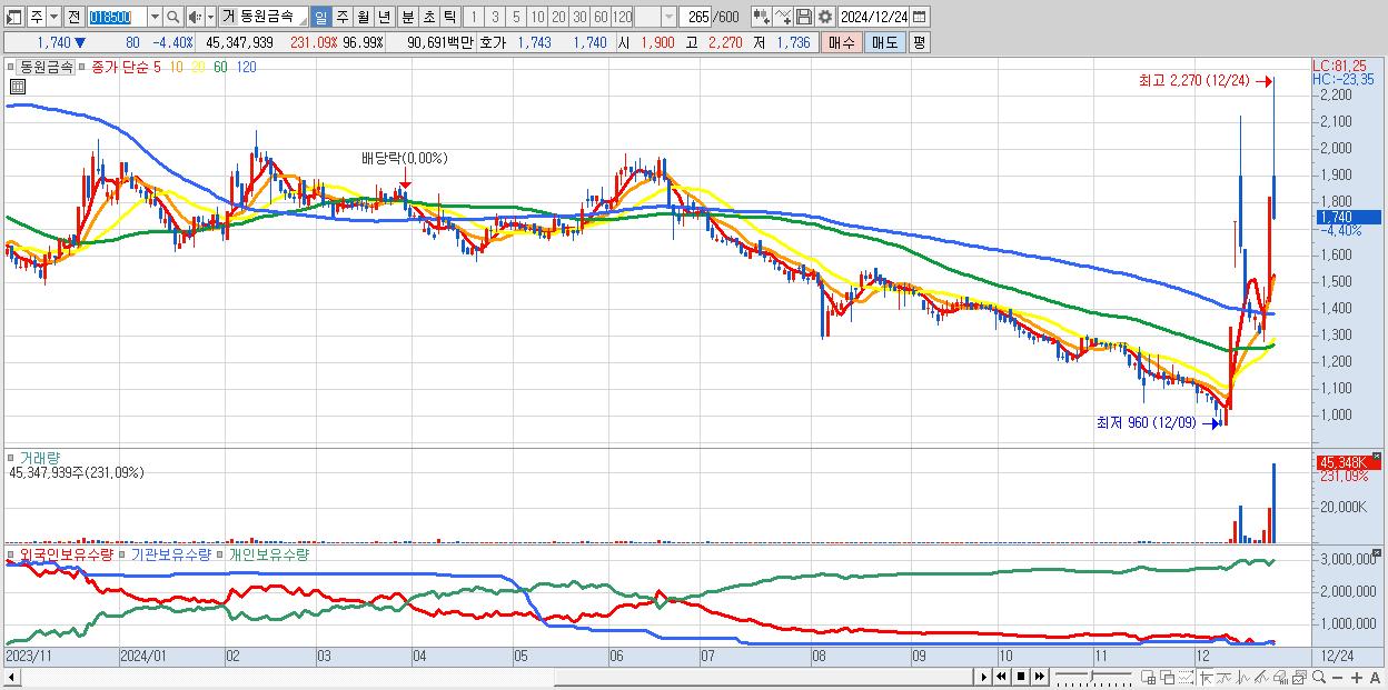 - 동원금속 (1,740원 ▼ -4.4% , 시총: 814억, 거래량: 45,347,939, 거래대금:907억)