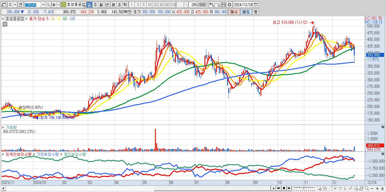 - 효성중공업 (393,000원 ▼ -7.42% , 시총: 36,645억, 거래량: 368,872, 거래대금:1,435억)