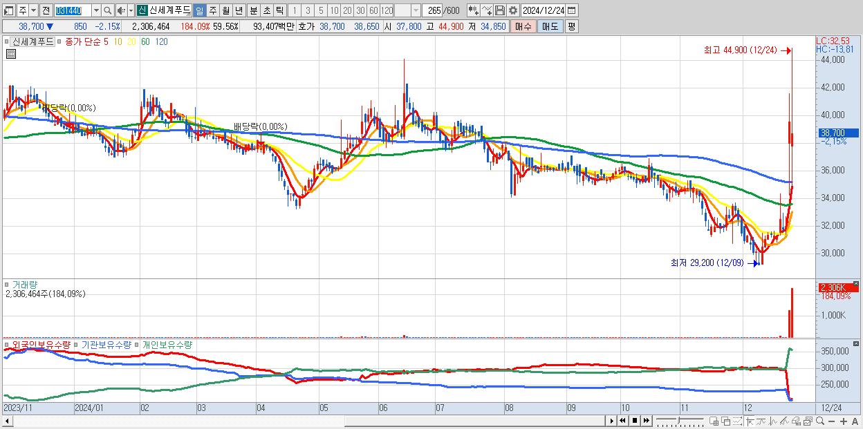 - 신세계푸드 (38,700원 ▼ -2.15% , 시총: 1,499억, 거래량: 2,306,464, 거래대금:934억)