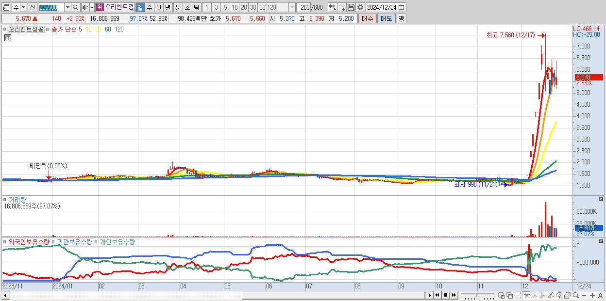 - 오리엔트정공 (5,670원 ▲ 2.53% , 시총: 1,800억, 거래량: 16,806,559, 거래대금:984억)
