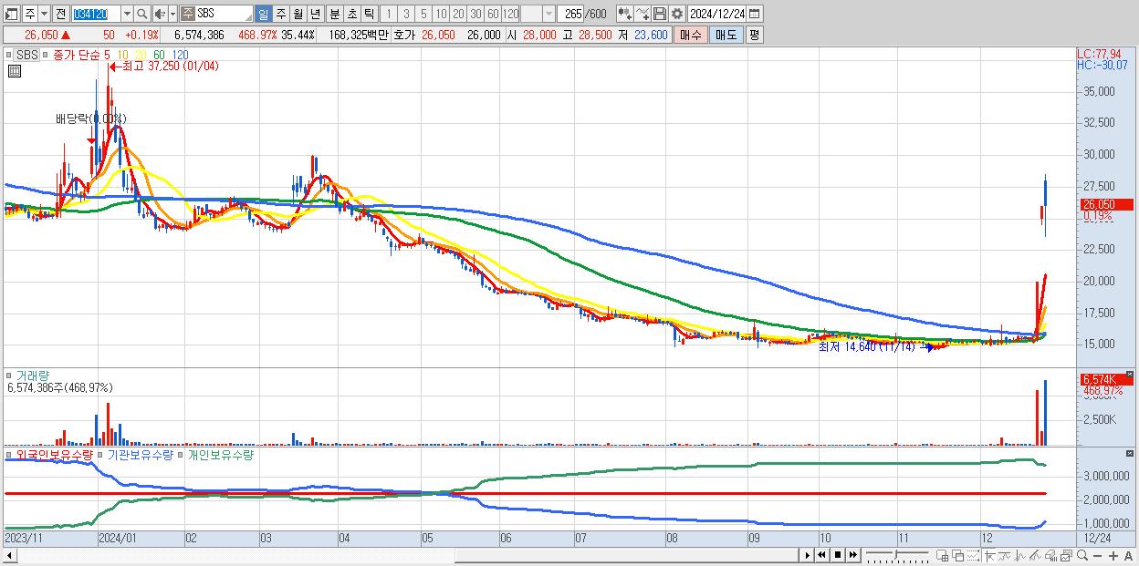 - SBS (26,050원 ▲ 0.19% , 시총: 4,833억, 거래량: 6,574,386, 거래대금:1,683억)