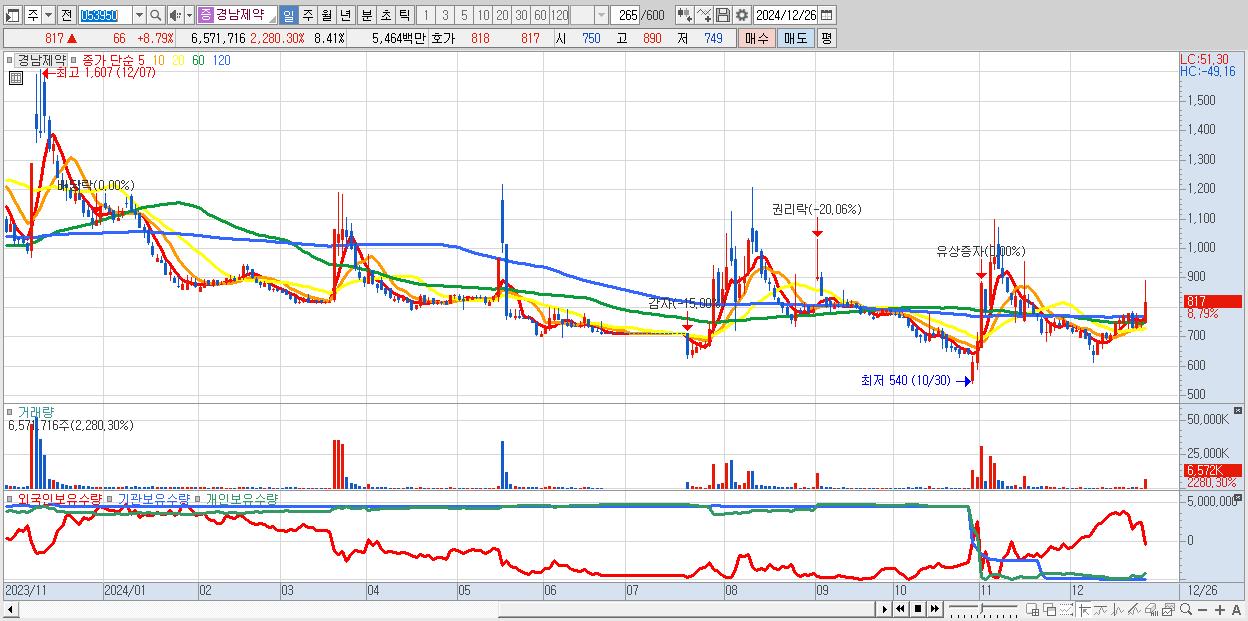 - 경남제약 (817원 ▲ 8.79% , 시총: 638억, 거래량: 6,571,716, 거래대금:55억)
