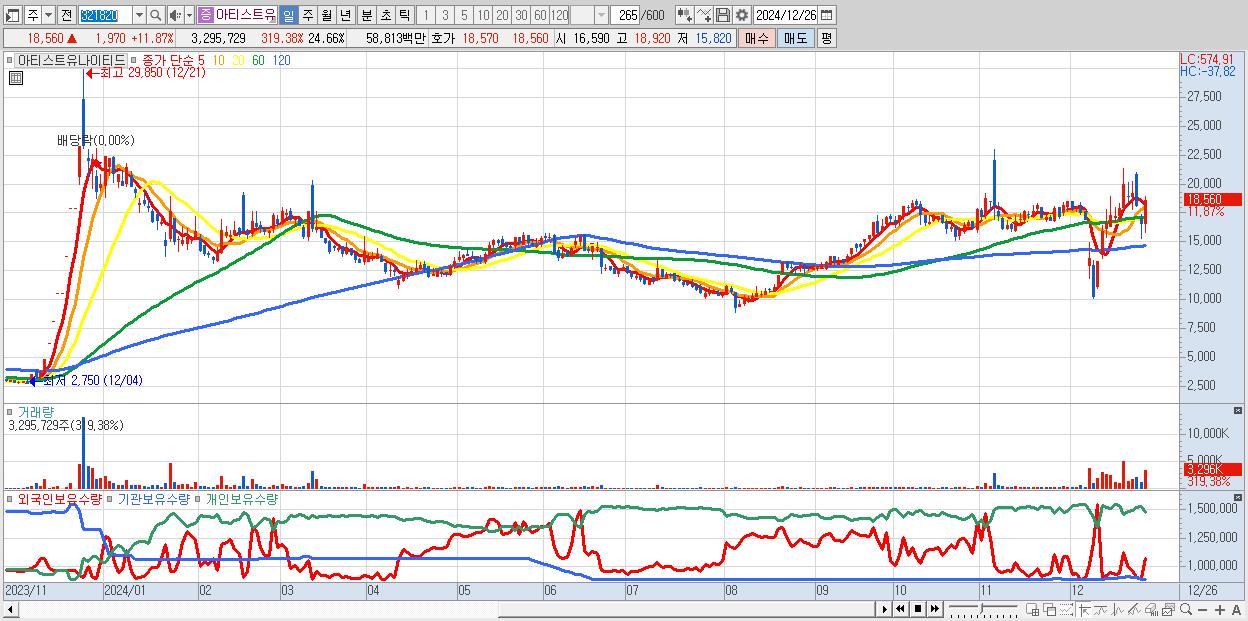 - 아티스트유나이티드 (18,560원 ▲ 11.87% , 시총: 2,481억, 거래량: 3,295,729, 거래대금:588억)