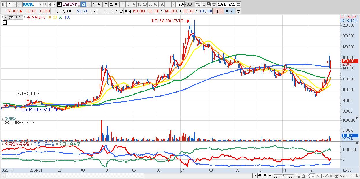 - 삼천당제약 (153,800원 ▲ 9.08% , 시총: 36,078억, 거래량: 1,282,200, 거래대금:1,915억)
