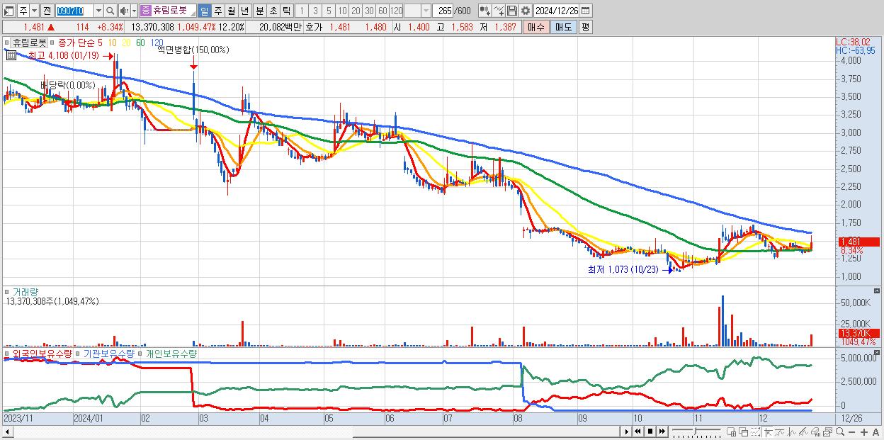 - 휴림로봇 (1,481원 ▲ 8.34% , 시총: 1,624억, 거래량: 13,370,308, 거래대금:201억)