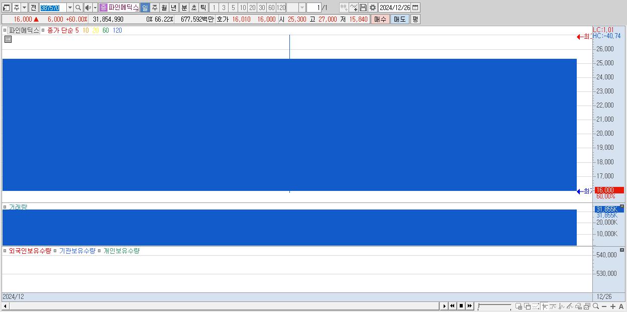 - 파인메딕스 (16,000원 ▲ 60% , 시총: 900억, 거래량: 31,854,990, 거래대금:6,776억)