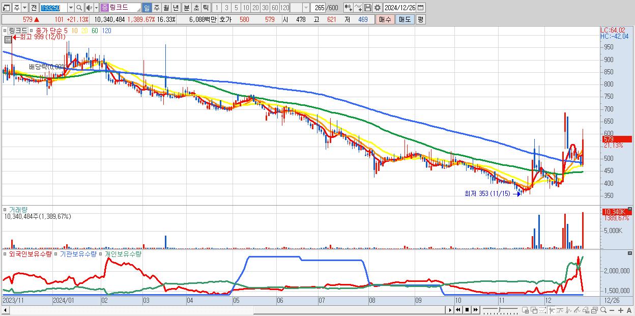 - 링크드 (579원 ▲ 21.13% , 시총: 367억, 거래량: 10,340,484, 거래대금:61억)