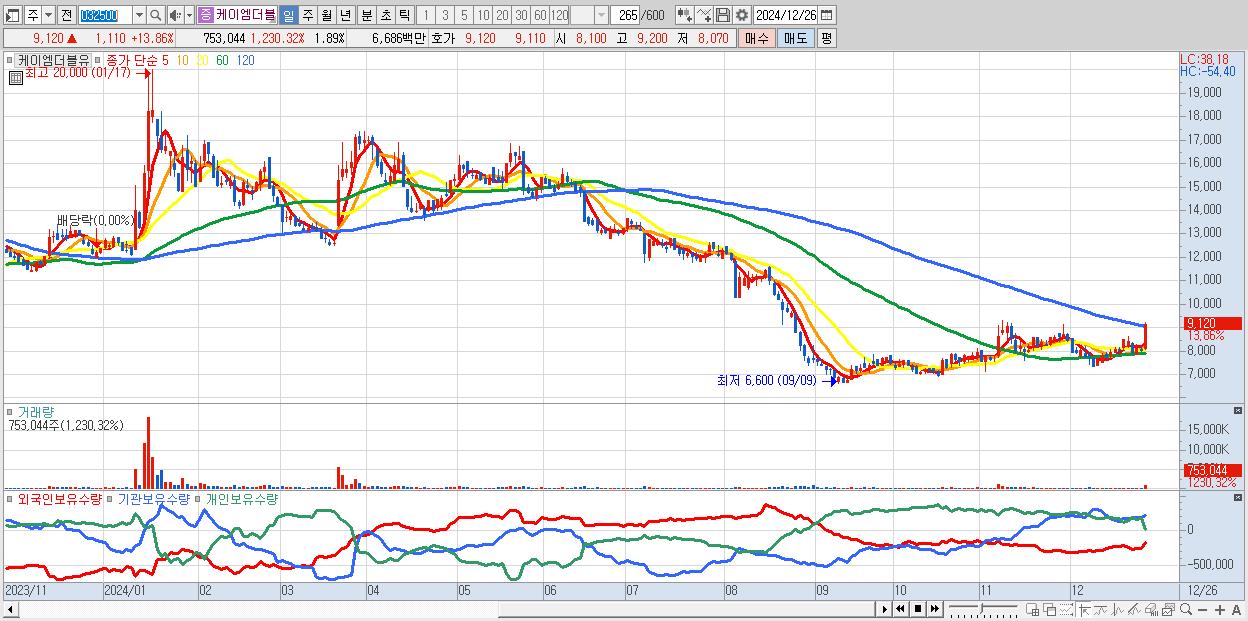 - 케이엠더블유 (9,120원 ▲ 13.86% , 시총: 3,632억, 거래량: 753,044, 거래대금:67억)