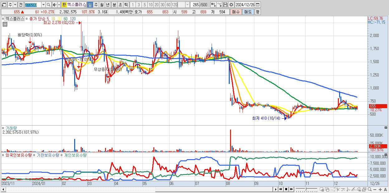 - 엑스플러스 (655원 ▲ 10.27% , 시총: 496억, 거래량: 2,392,575, 거래대금:15억)