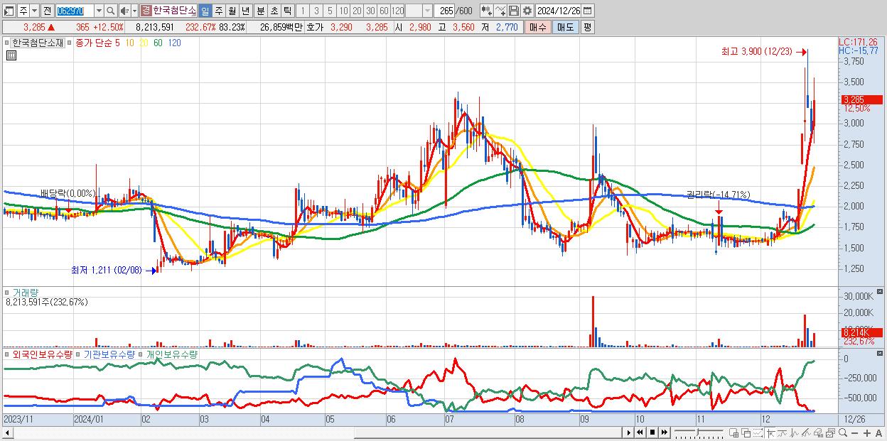 - 한국첨단소재 (3,285원 ▲ 12.5% , 시총: 324억, 거래량: 8,213,591, 거래대금:269억)