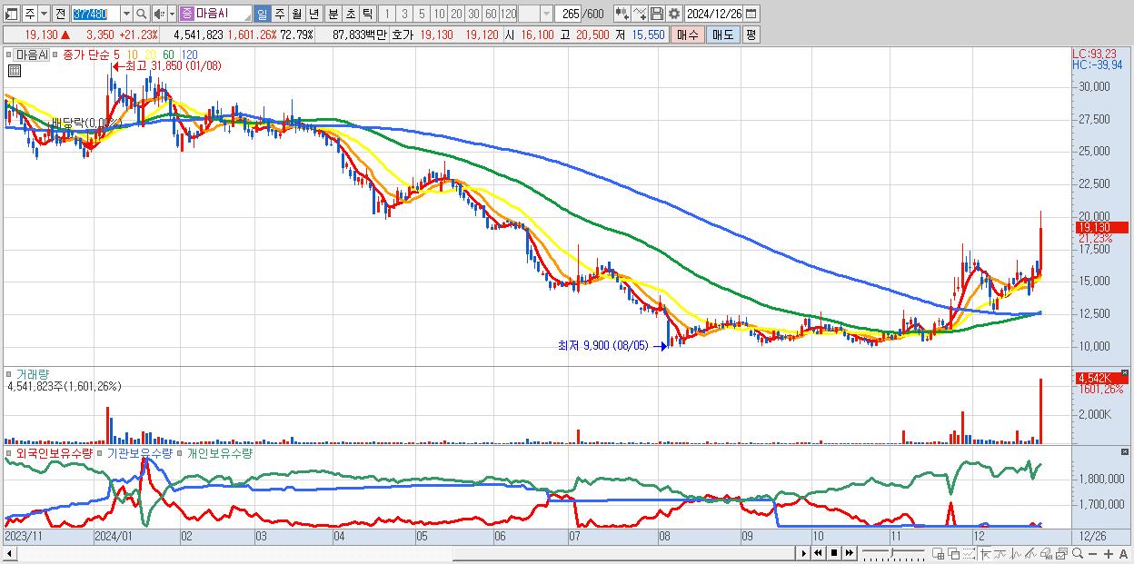 - 마음AI (19,130원 ▲ 21.23% , 시총: 1,194억, 거래량: 4,541,823, 거래대금:878억)