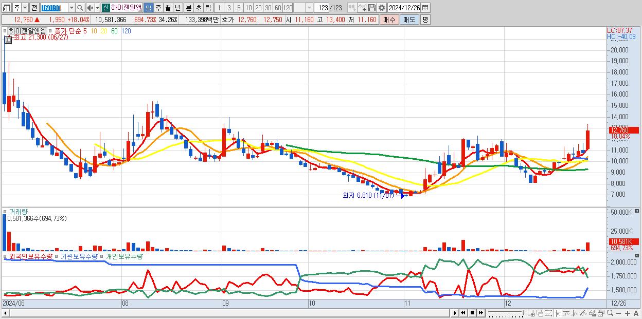 - 하이젠알앤엠 (12,760원 ▲ 18.04% , 시총: 3,941억, 거래량: 10,581,366, 거래대금:1,334억)