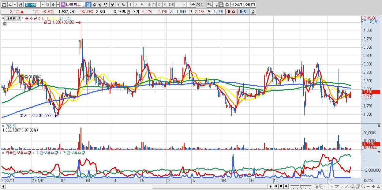 - 다보링크 (2,170원 ▲ 8.5% , 시총: 942억, 거래량: 1,532,730, 거래대금:32억)