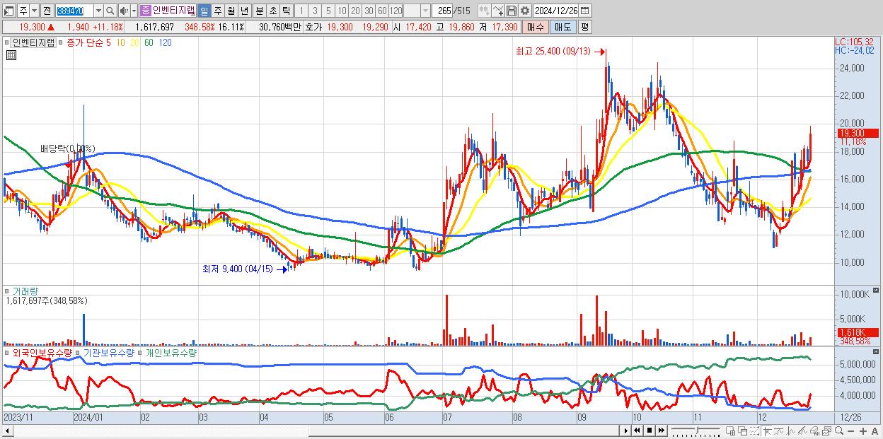 - 인벤티지랩 (19,300원 ▲ 11.18% , 시총: 1,938억, 거래량: 1,617,697, 거래대금:308억)