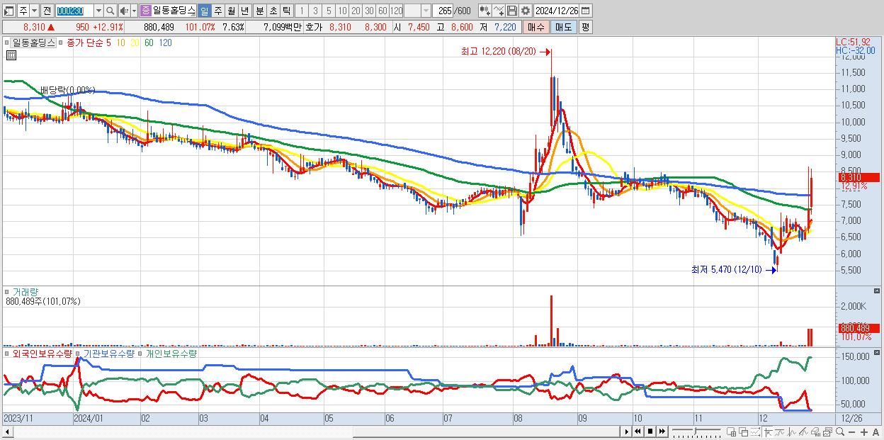 - 일동홀딩스 (8,310원 ▲ 12.91% , 시총: 959억, 거래량: 880,489, 거래대금:71억)