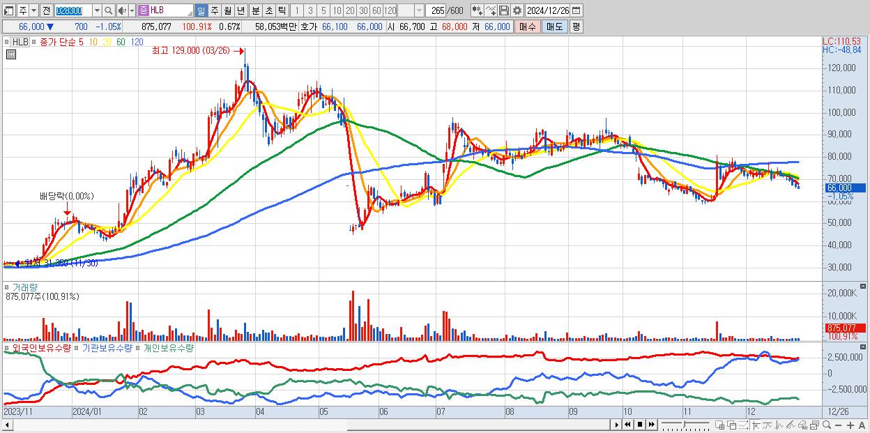 - HLB (66,000원 ▼ -1.05% , 시총: 86,716억, 외국인 순매수 거래금:48억)