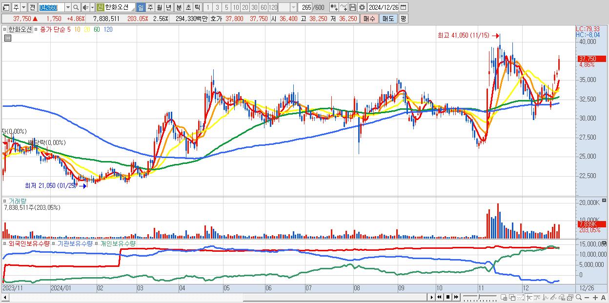 - 한화오션 (37,750원 ▲ 4.86% , 시총: 115,671억, 외국인 순매수 거래금:157억)
