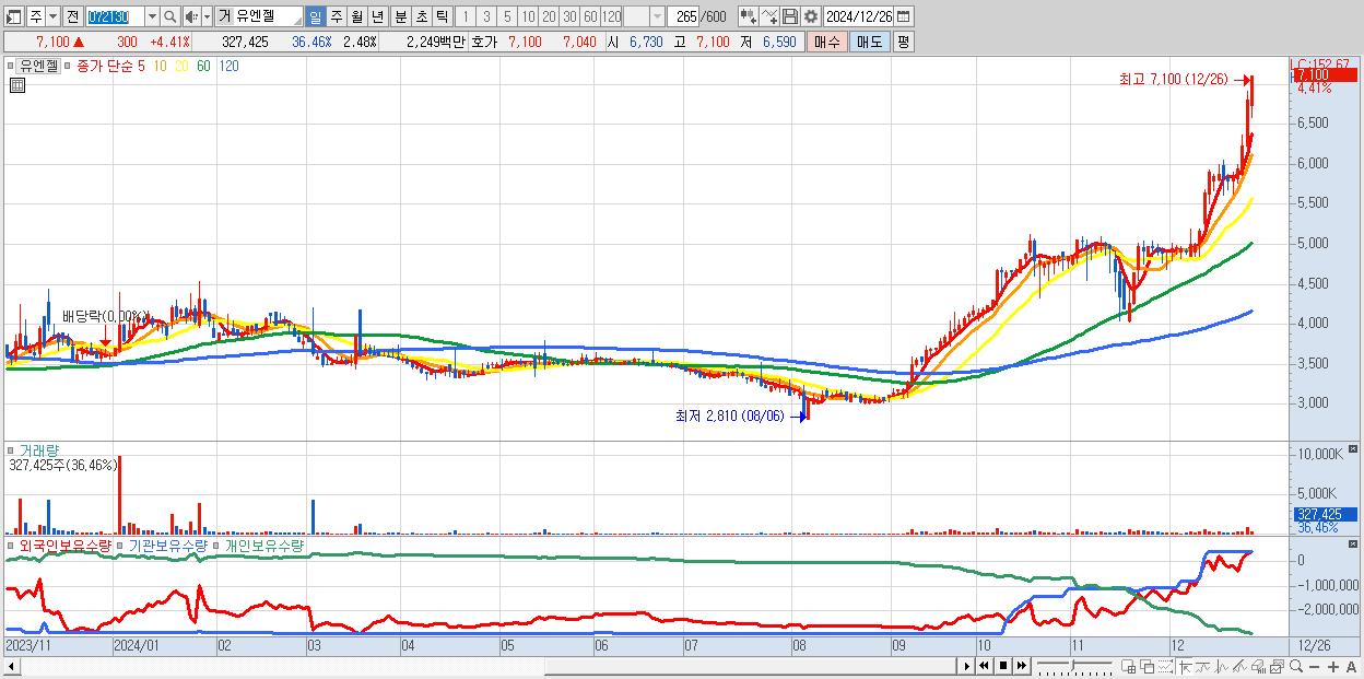 - 유엔젤 (7,100원 ▲ 4.41% , 시총: 937억, 거래량: 327,425, 거래대금:22억, KOSPI)