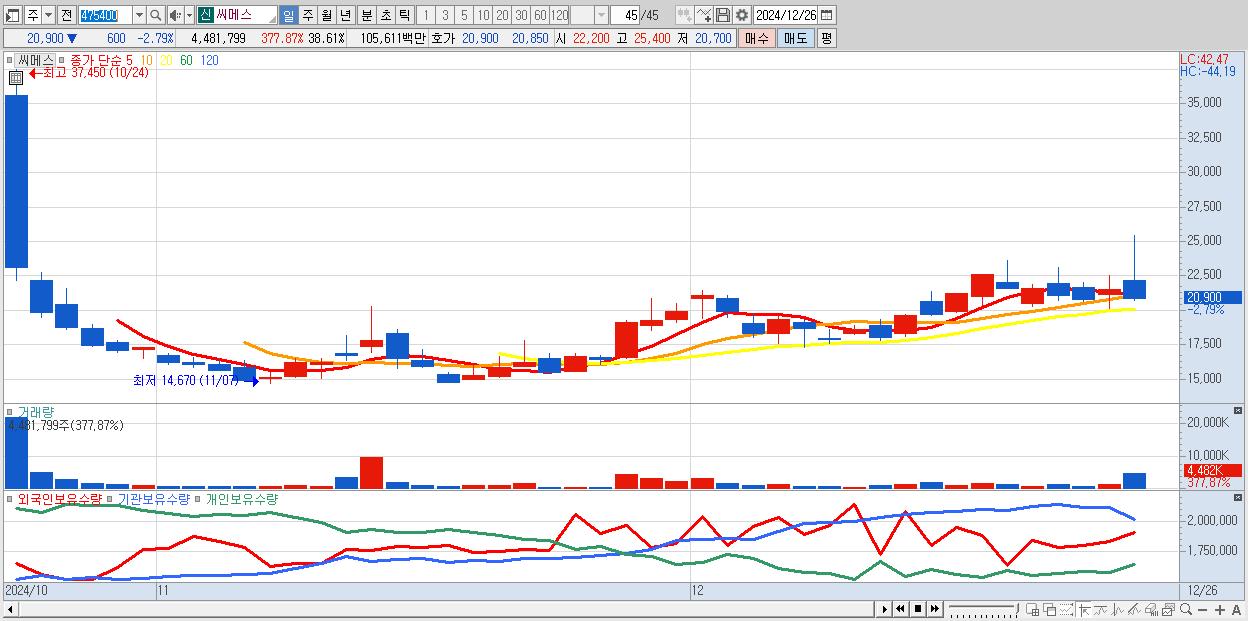 - 씨메스 (20,900원 ▼ -2.79% , 시총: 2,426억, 거래량: 4,481,799, 거래대금:1,056억)