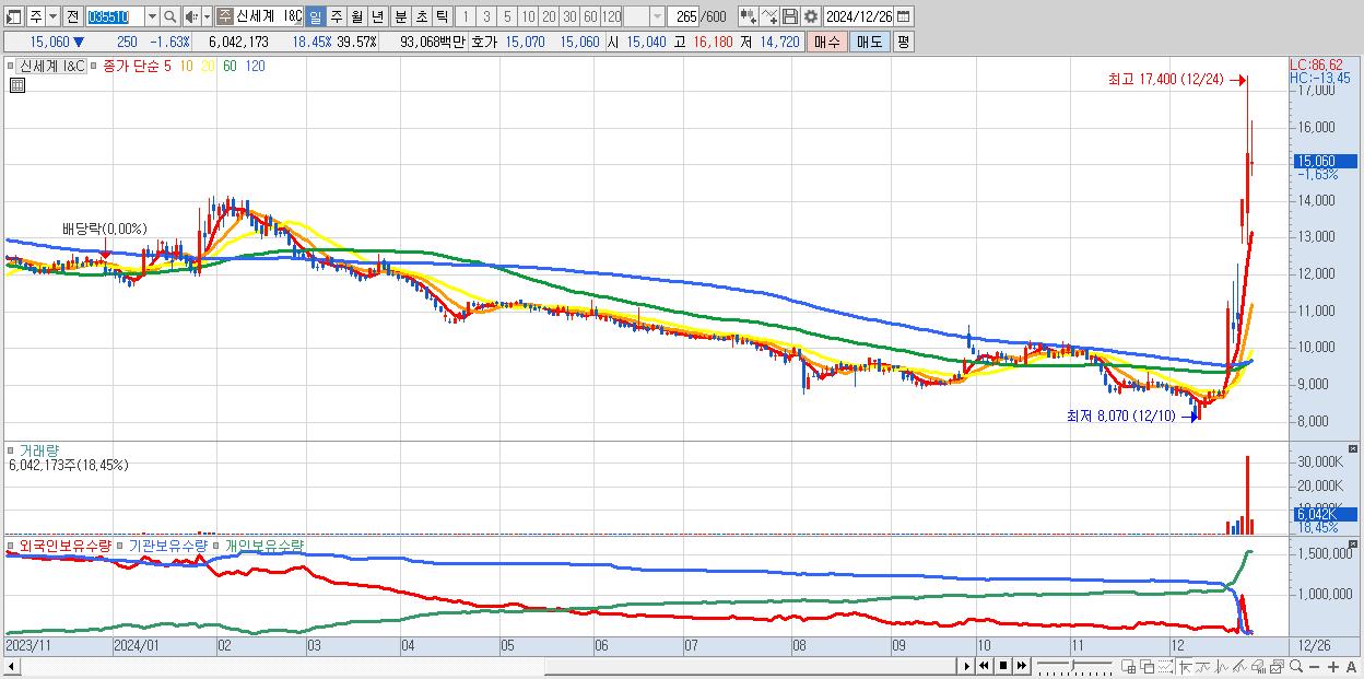 - 신세계 I&C (15,060원 ▼ -1.63% , 시총: 2,299억, 거래량: 6,042,173, 거래대금:931억)