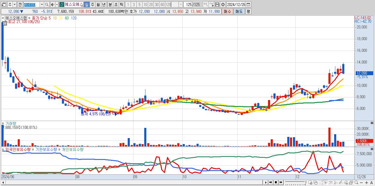 - 에스오에스랩 (12,090원 ▼ -5.91% , 시총: 2,138억, 거래량: 7,680,159, 거래대금:1,006억)