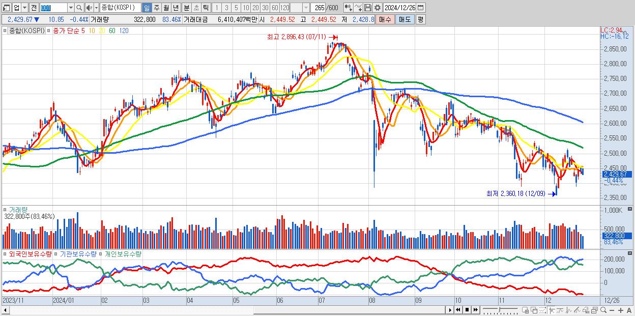 | 12/26 | 2,429.67 | ▼-0.44% | -3,242억 | 199억 | 1,858억 | 1,186억 |