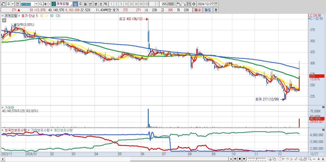 - 큐캐피탈 (271원 ▲ 13.87% , 시총: 483억, 거래량: 40,140,570, 거래대금:114억)