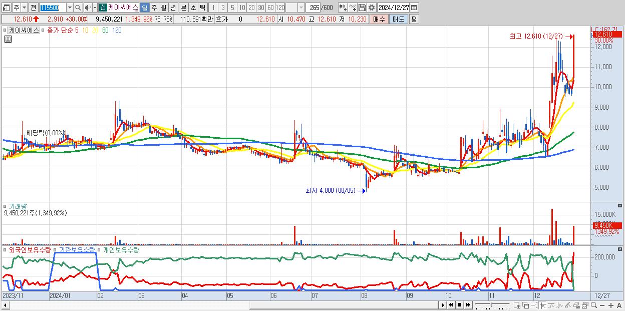 - 케이씨에스 (12,610원 ▲ 30% , 시총: 1,513억, 거래량: 9,450,221, 거래대금:1,109억)