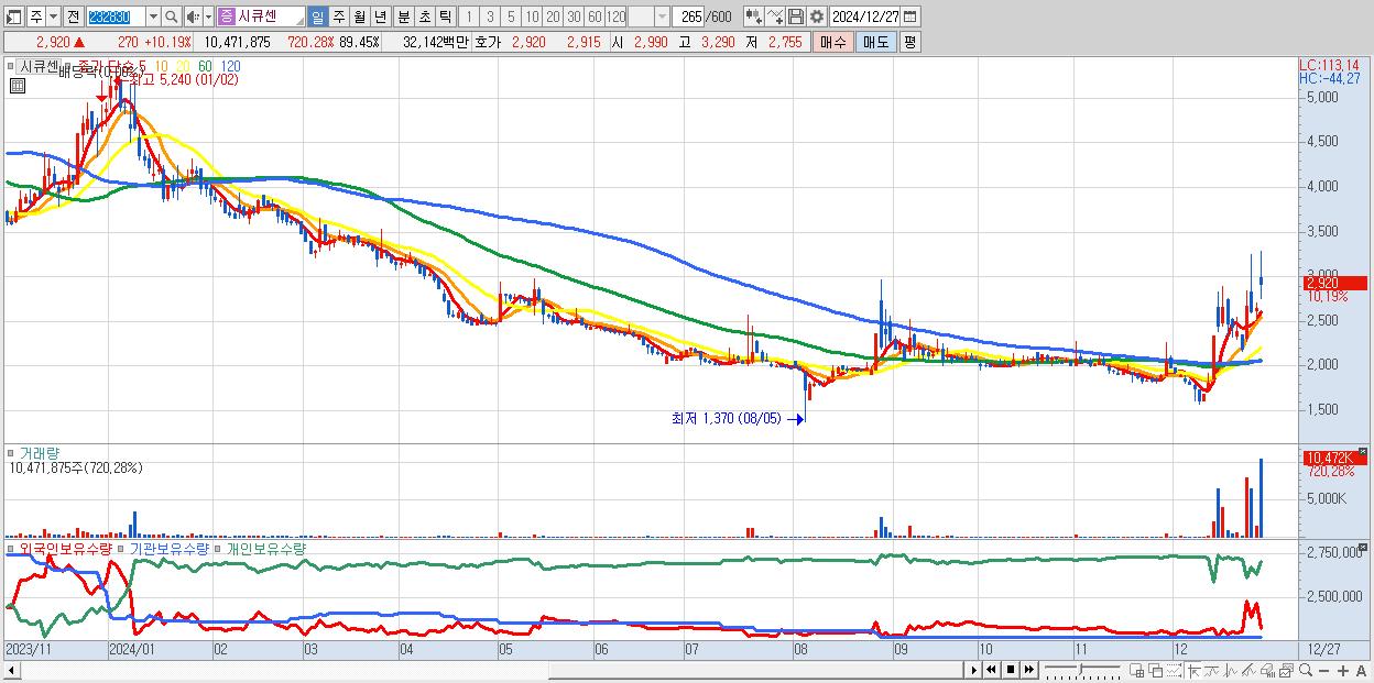 - 시큐센 (2,920원 ▲ 10.19% , 시총: 342억, 거래량: 10,471,875, 거래대금:321억)