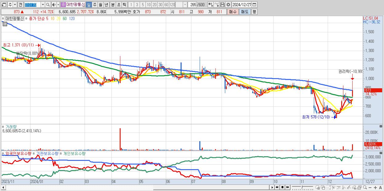 - 대한광통신 (873원 ▲ 14.72% , 시총: 650억, 거래량: 6,600,685, 거래대금:60억)