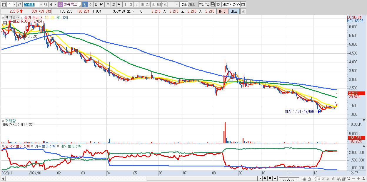 - 젠큐릭스 (2,215원 ▲ 29.84% , 시총: 338억, 거래량: 165,263, 거래대금:4억)