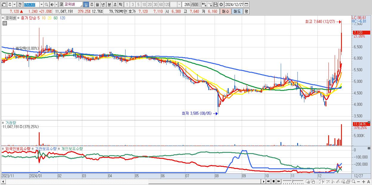 - 코위버 (7,120원 ▲ 21.09% , 시총: 698억, 거래량: 11,047,191, 거래대금:798억)