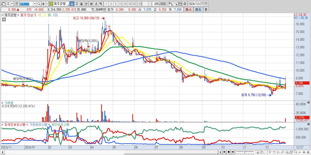 - 제주은행 (8,390원 ▲ 8.68% , 시총: 2,696억, 거래량: 8,314,559, 거래대금:728억)