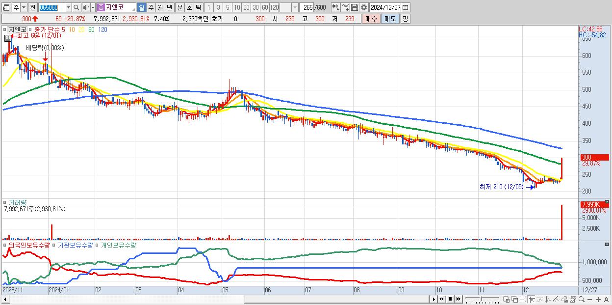 - 지엔코 (300원 ▲ 29.87% , 시총: 324억, 거래량: 7,992,671, 거래대금:24억)