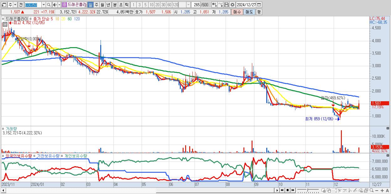 - 드래곤플라이 (1,507원 ▲ 17.19% , 시총: 209억, 거래량: 3,152,721, 거래대금:49억)