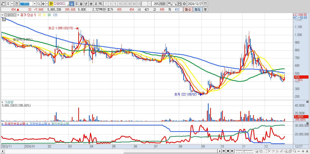 - 디와이디 (454원 ▲ 7.84% , 시총: 459억, 거래량: 5,865,338, 거래대금:27억)