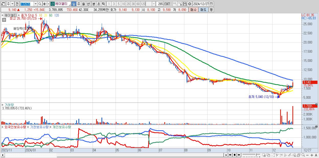 - 에이엘티 (9,140원 ▲ 15.84% , 시총: 819억, 거래량: 3,789,895, 거래대금:343억)