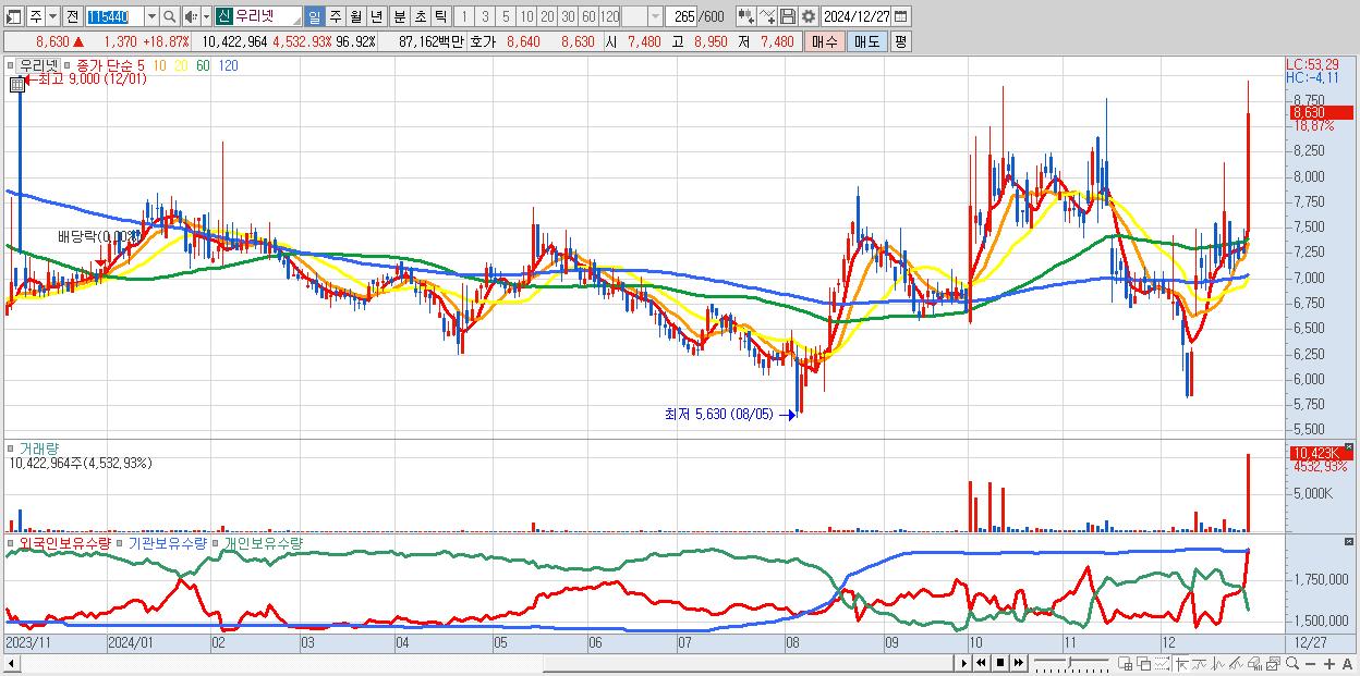 - 우리넷 (8,630원 ▲ 18.87% , 시총: 928억, 거래량: 10,422,964, 거래대금:872억)