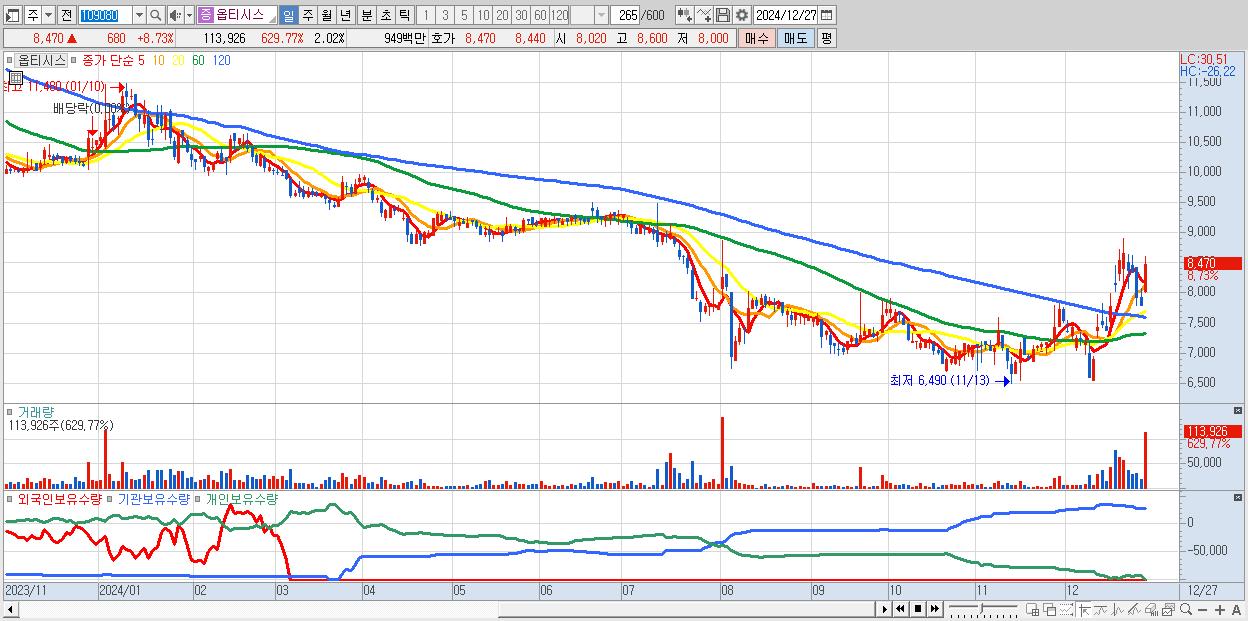 - 옵티시스 (8,470원 ▲ 8.73% , 시총: 477억, 거래량: 113,926, 거래대금:9억)