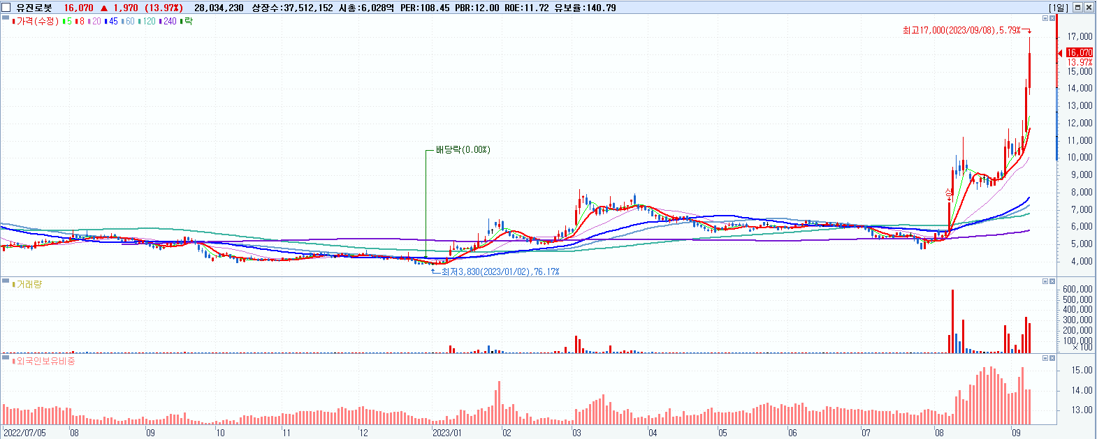 유진로봇 16,070원 ▲ 13.97% (KOSDAQ, 056080)
