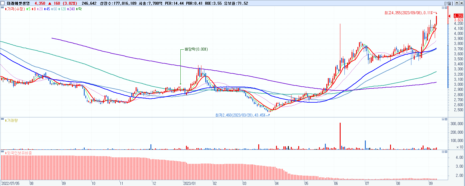 - 미래에셋생명 (4,350원 ▲ 3.82% , 시총: 7,700억, 거래량: 246,647, 거래대금:11억, KOSPI)
