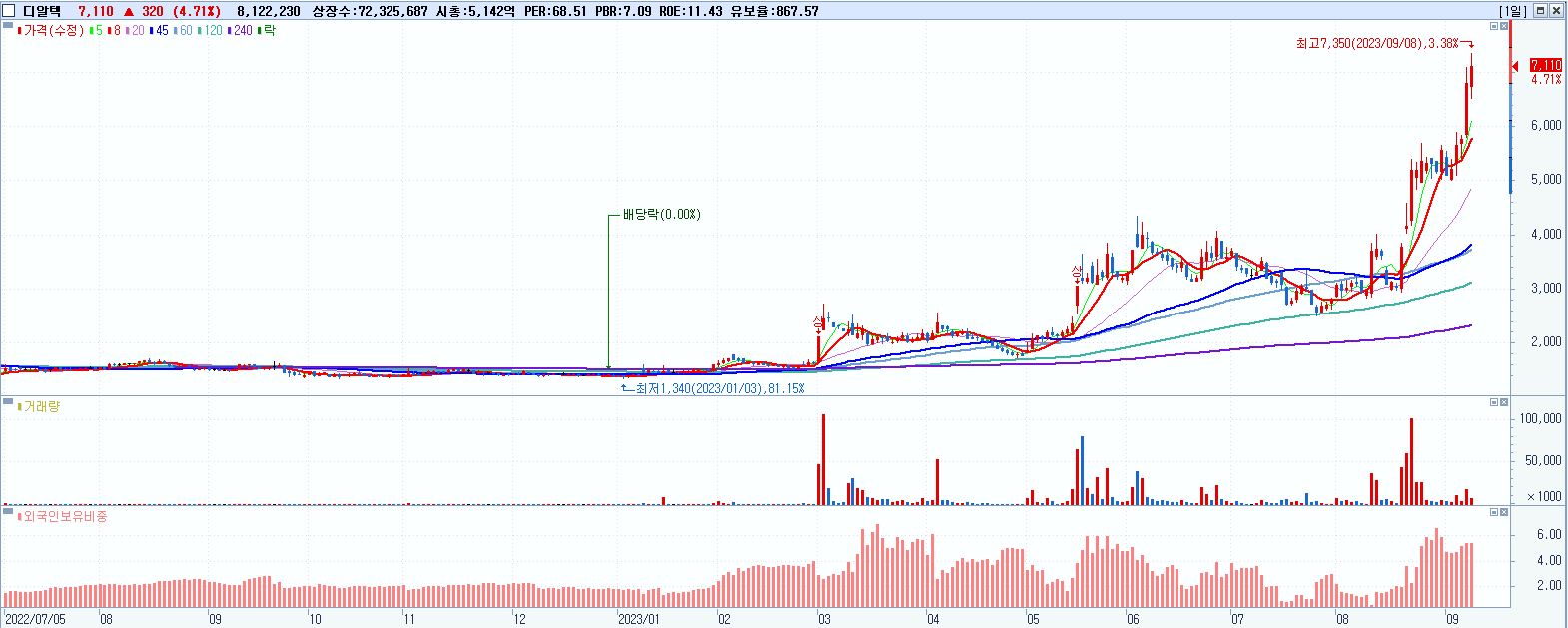 - 디알텍 (7,110원 ▲ 4.71% , 시총: 5,142억, 거래량: 8,132,328, 거래대금:569억, KOSDAQ)