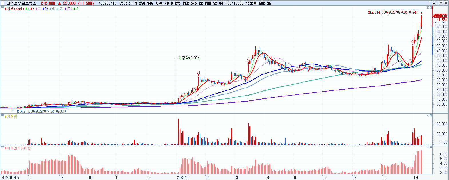 - 레인보우로보틱스 (212,000원 ▲ 11.58% , 시총: 40,812억, 거래량: 4,584,476, 거래대금:9,291억, KOSDAQ)