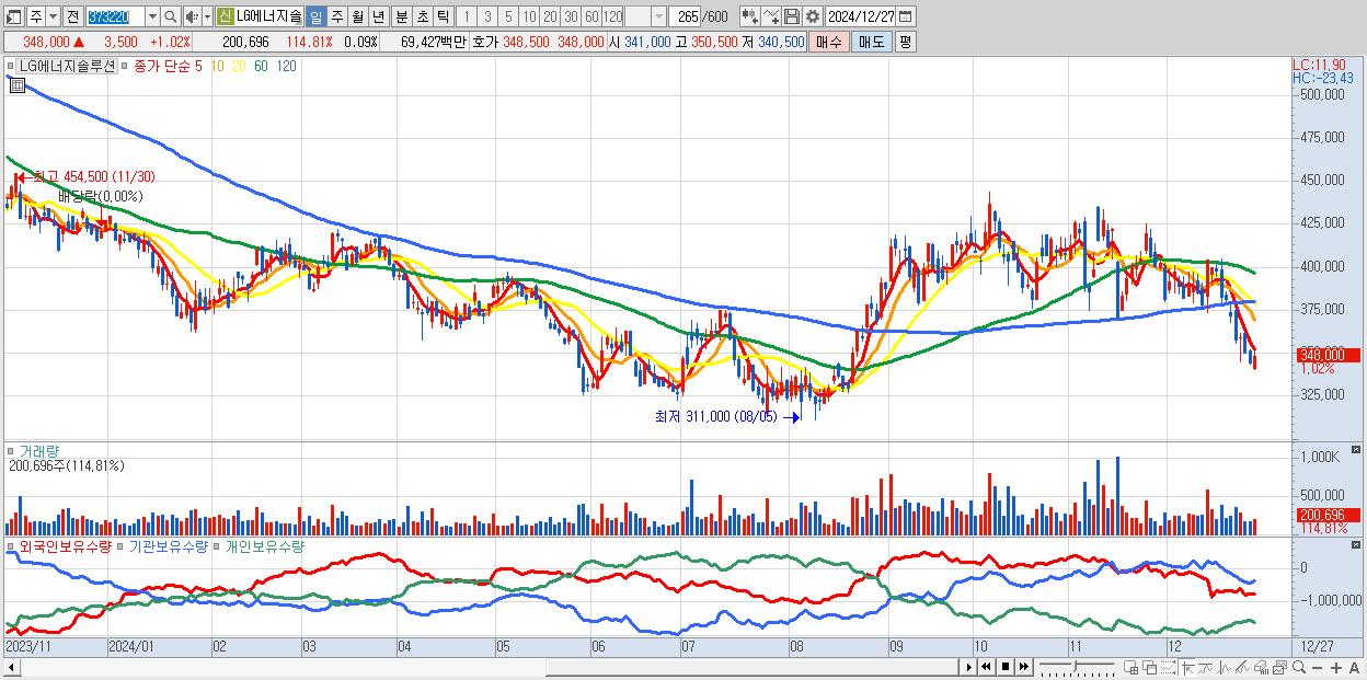- LG화학 (247,000원 ▼ -0.4% , 시총: 174,363억, 외국인 순매수 거래금:35억)